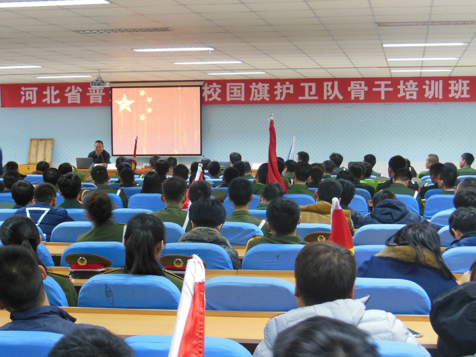 2015年11月8日上午八时,随着国歌的唱响,河北省大学生高校国旗护卫队骨干培训班在石家庄科技工程职业学院会议室拉开序幕。河北省教育厅思政体卫处副处长靳学军,天安门国旗班第八任班长、北京新风旗帜文化传播中心主任、北京高校规范化升旗仪式总教官赵新风出席本次活动。