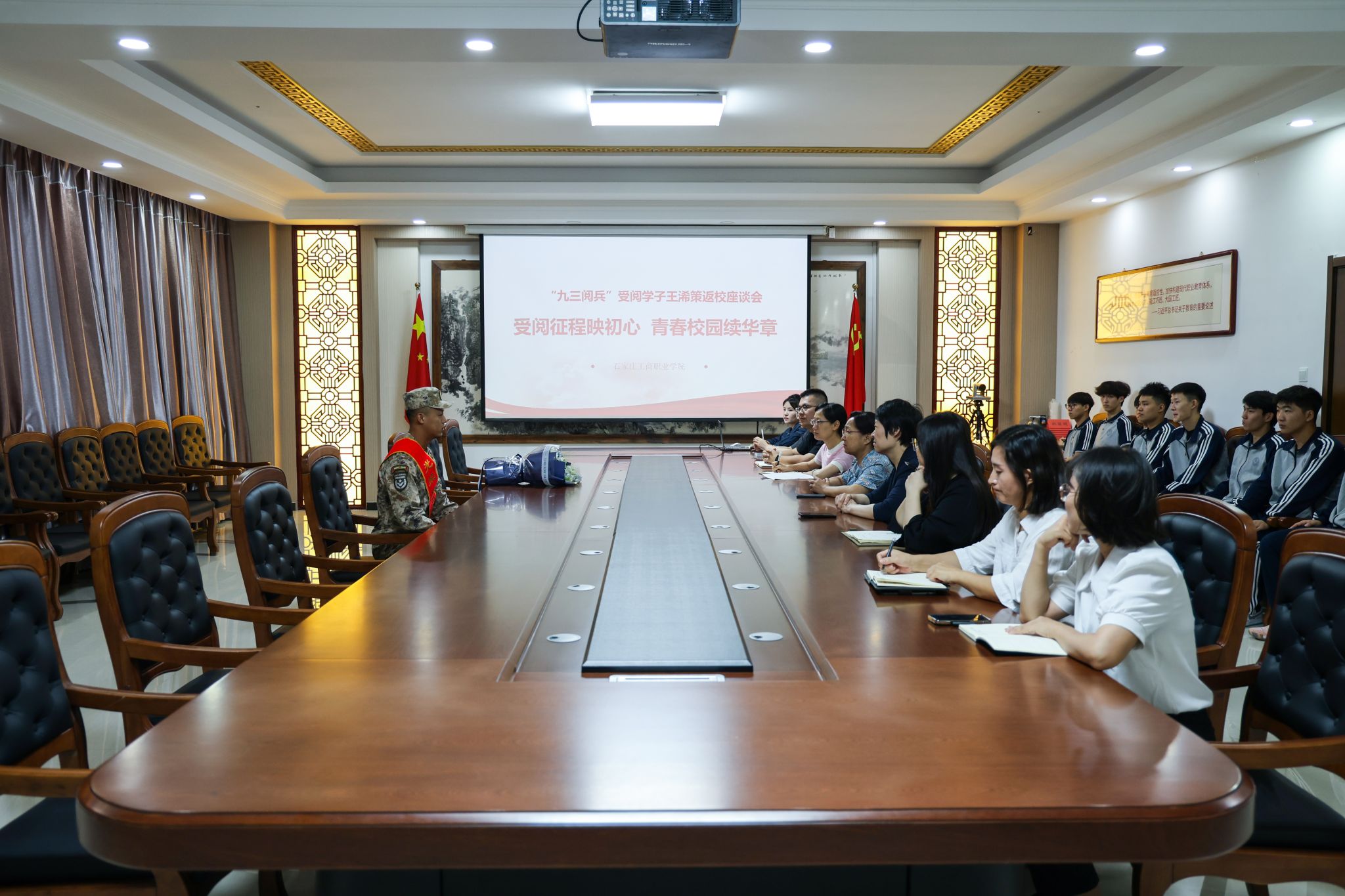现场,2025级参训新生整齐列队,组成气势昂扬的欢迎方阵。“欢迎学长载誉归来”的口号铿锵有力,响彻校园上空,既传递着对榜样的崇敬,更彰显出工商学子奋发向上的精神风貌。随后,“受阅征程映初心 青春校园续华章”主题座谈会在行知楼404会议室召开。