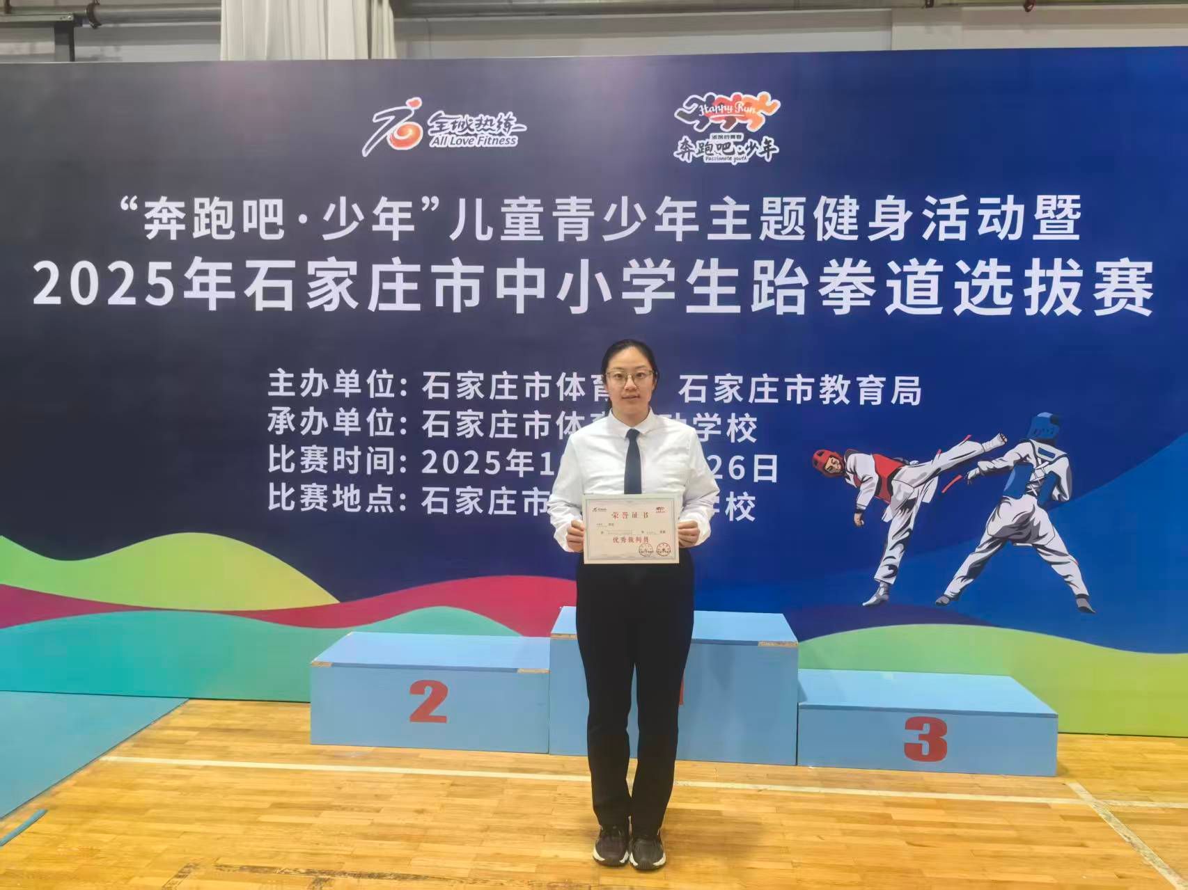 日前,“奔跑吧·少年”儿童青少年主题健身活动暨2025年石家庄市中小学生跆拳道选拔赛在石家庄市体育运动学校圆满收官。学院体育教学部专任教师刘佳瑜受邀担任赛事裁判员,凭借精湛的专业能力、公正严谨的执裁作风,从众多裁判中脱颖而出,获评“优秀裁判员”荣誉称号。