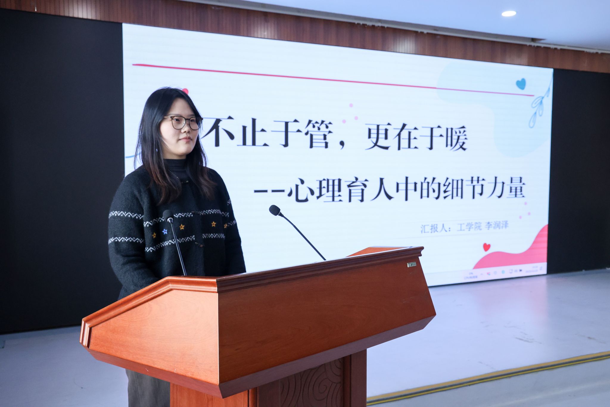 工学院辅导员李润泽以“不止于管,更在于暖——心理育人中的细节力量”为主题,强调通过前置预防、日常精准施策与长效关怀,在细节中传递温暖,筑牢学生心理防护网。