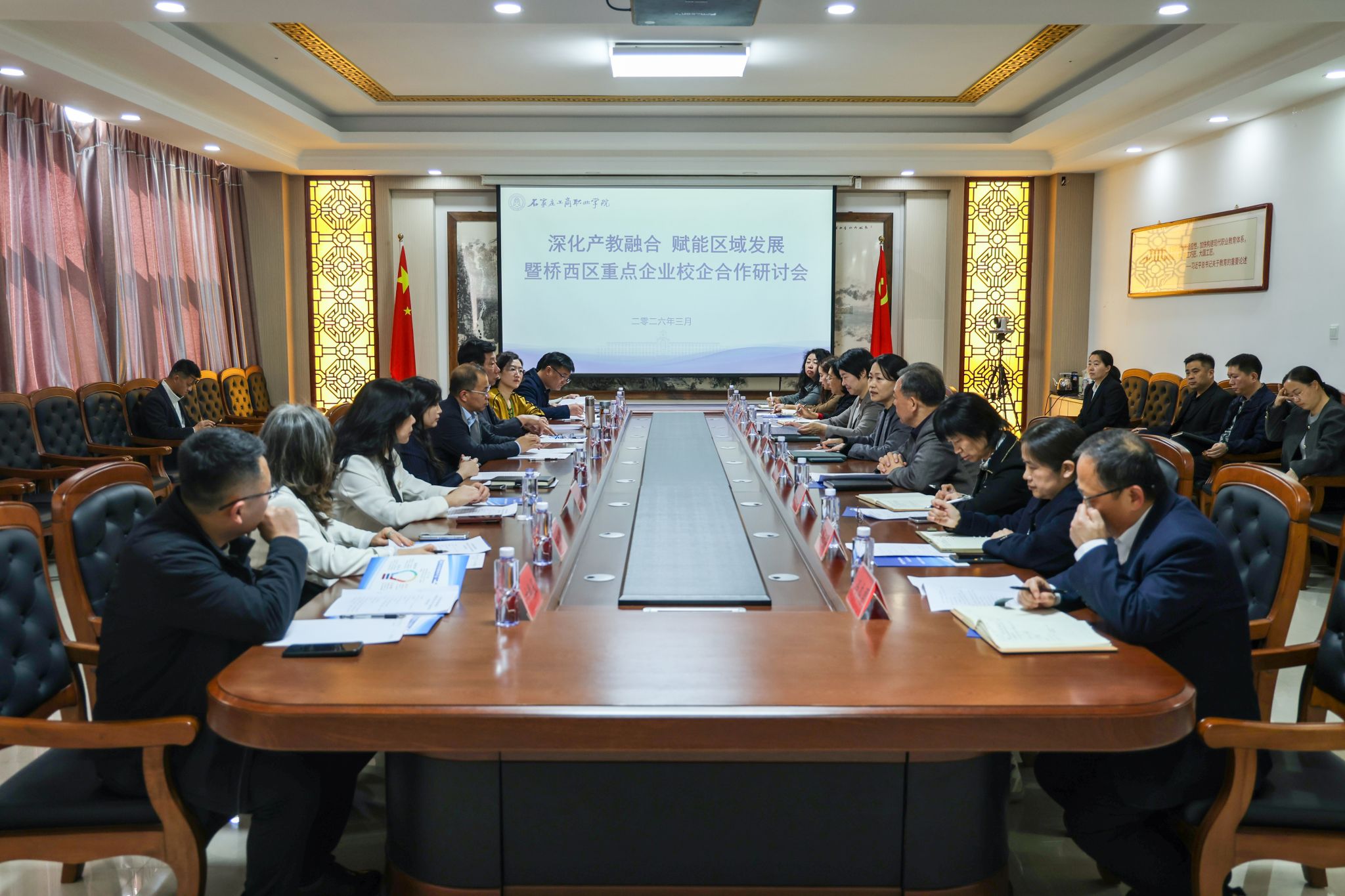 3月31日下午,“深化产教融合 赋能区域发展”暨桥西区重点企业校企合作研讨会在石家庄工商职业学院举行。与会嘉宾围绕人才培养、实习就业、基地共建等内容深入交流,达成多项合作共识。石家庄市桥西区人力资源和社会保障局局长黄振国带领中国石家庄人力资源服务产业园桥西园区、河北省家庭服务业协会及桥西区重点企业来校参会,院长李岩清出席会议并致辞,副院长赵栓亮及相关部门负责人参加活动。党委副书记、院长助理卓丽杰主持研讨会。