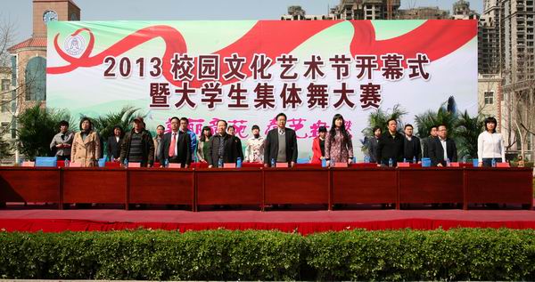 今天,学院运动场主席台四周绿草如茵、鲜花簇拥,一块“2013美丽商院校园文化艺术节开幕式暨大学生集体舞大赛”的巨型幕布格外醒目。院长马子孔、副院长李岩清、副院长吕占华,二级学院院长、行政处室和系部负责人出席会议。四千多名学生齐聚这里,欢度属于自己的盛大节日,涂写属于春天的多彩画卷。