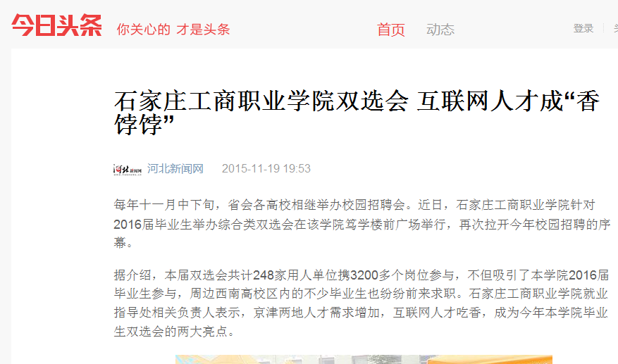 据介绍,本届双选会共计248家用人单位携3200多个岗位参与,不但吸引了本学院2016届毕业生参与,周边西南高校区内的不少毕业生也纷纷前来求职。石家庄工商职业学院就业指导处相关负责人表示,京津两地人才需求增加,互联网人才吃香,成为今年本学院毕业生双选会的两大亮点。