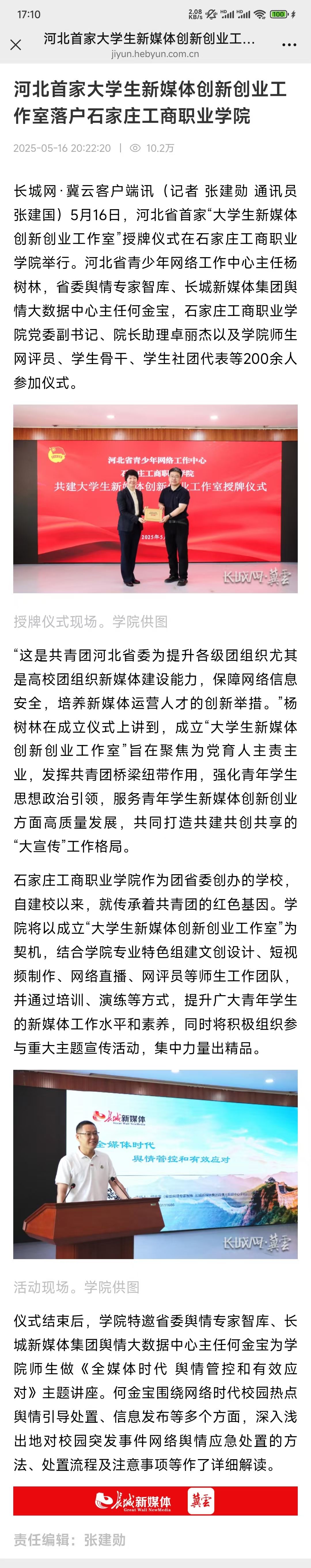 长城网冀云客户端、河北新闻网报道河北首家“大学生新媒体创新创业工作室”落户我院