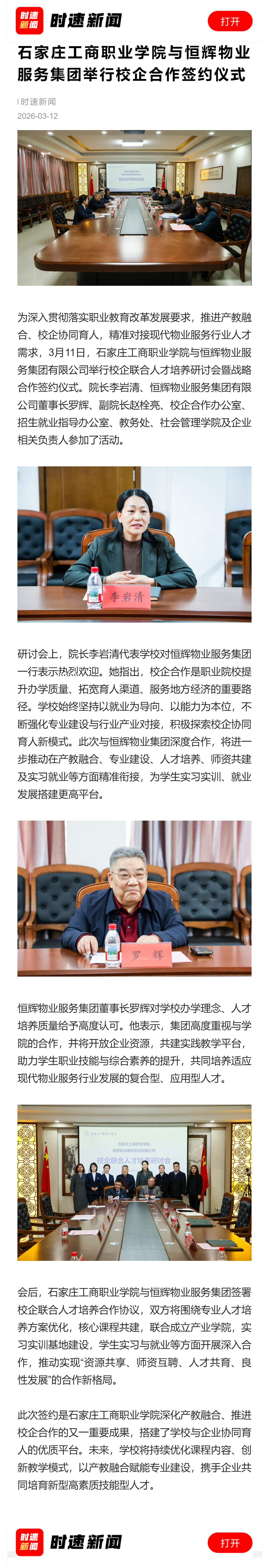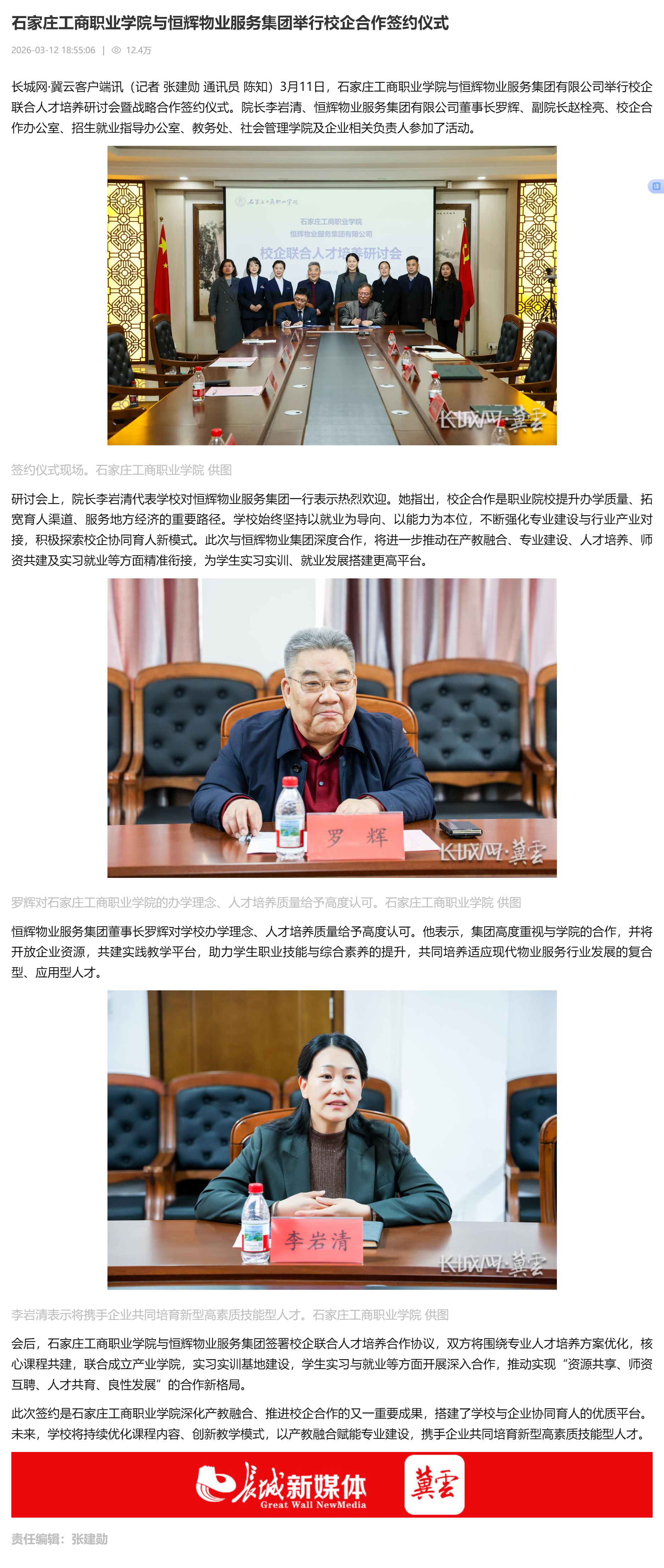 时速新闻、长城网冀云客户端报道我院与恒辉物业服务集团举行校企合作签约仪式